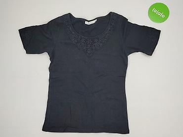 Bluzka damska, czarna, z krótkim rękawem. - Fason: prosta, lekko dopasowana - Dekolt: okrągły z ażurowym wykończeniem - Rękawy: krótkie, zakończone ażurową lamówką - Dół: ażurowe, falowane wykończ...