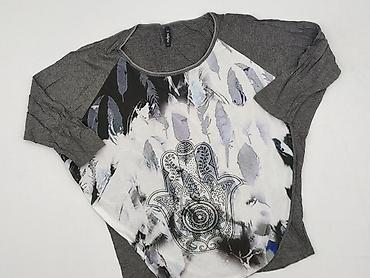 Bluzka damska z długim rękawem i nadrukiem - Kolor: odcienie szarości z elementami czerni, bieli i błękitu - Krój: okrągły dekolt, długie rękawy, lekko zaokrąglony dół - Przód: duży nadruk graficz...