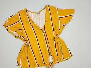 Damska bluzka w paski, rozmiar M - Krój: luźny, oversize’owy, z krótkim kimono-rękawem - Dekolt: w serek z niewielkim rozcięciem - Wzór: pionowe pasy w odcieniach granatu, musztardowej żółci, biel...
