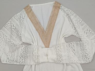 Biała bluzka damska z półprzezroczystego materiału, z ozdobnymi wstawkami z koronki. - Krój: lekko luźna, długie rękawy zakończone gumką, wiązanie pod szyją (dekoracyjna tasiemka/„krawat”). - Deta...
