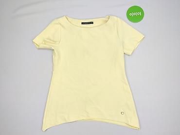 Żółta bluzka damska z krótkim rękawem - Krój: luźny, z obniżoną linią ramion; dekolt w kształcie litery V z ozdobną plisą. - Rozmiar: S (z metki). - Materiał: 95% poliester, 5% spandex – lekko ela...