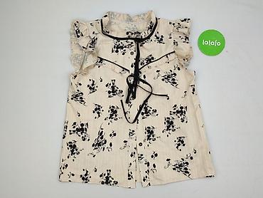 Bluzka damska w kwiaty, rozmiar M. - Fason: bez rękawów, z romantyczną falbaną przy dekolcie i na ramionach - Dekolt: kopertowy/V - Zapięcie: z przodu na guziki - Dół: lekko marszczony, elastyczny...