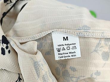 Bluzka damska bez rękawów, rozmiar M. Jasny beż z czarnym, kwiatowym nadrukiem. Materiał: 100% poliester (metka na zdjęciu). Lekko fakturowana tkanina, przewiewna i łatwa w pielęgnacji – pranie w pralce 30°C, delikatny program, można prasować.