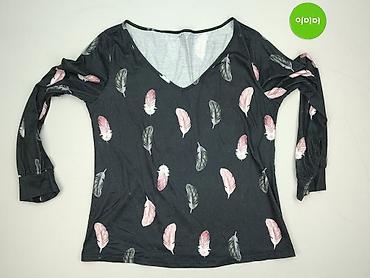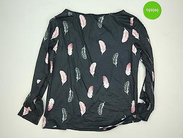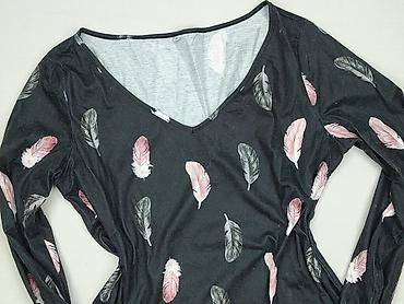 Bluzka damska z długim rękawem, rozmiar S. - Kolor bazowy: czarny - Wzór: pióra w odcieniach różu, bieli i szarości - Dekolt: w kształcie litery V z niewielkim nacięciem - Rękawy: długie, zakończo...