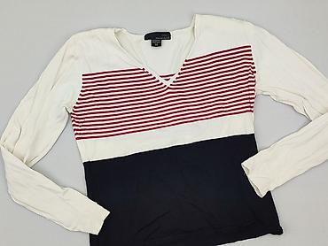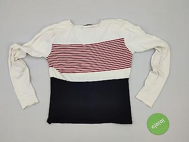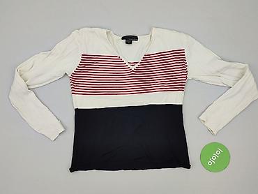 Damska bluzka w paski, rozmiar L - Krój: z długim rękawem, lekko zaokrąglony dół - Dekolt: kopertowy/V z ozdobnymi trzema guzikami - Wzór: poziome paski w odcieniach granatu, bieli i melanżowego s...