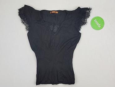 Czarna damska bluzka z krótkim rękawem, rozmiar M. - Dekolt w kształcie litery V z przodu i z tyłu, ozdobiony taśmą z drobnymi nitami/koralikami w kolorze srebrnym - Krótkie, lekko bufiaste ręk...