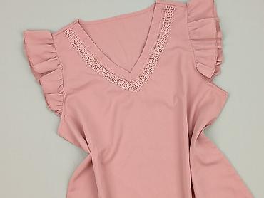 Bluzka damska IO-09, rozmiar S. - Kolor: pastelowy róż - Fason: luźny, z delikatnie zaokrąglonym dołem - Rękawy: krótkie, z transparentnymi wstawkami z koronki na ramionach - Tył: pionowa wstawka ...