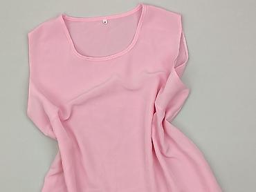 Bluzka damska bez rękawów w kolorze jasnoróżowym. - Rozmiar: M - Fason: lekko dopasowany, dekolt w serek - Rękawki: krótkie, falbaniaste - Materiał: ażurowa, przewiewna dzianina z delikatnym wzore...