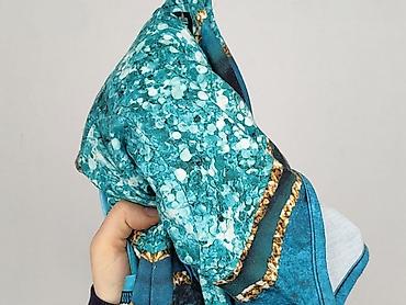 Bluzka damska z lekkiej, zwiewnej tkaniny - Krój: luźny, prosty, z krótkim rękawem typu kimono; dekolt w kształcie litery V - Wzór: geometryczno‑mozaikowy, turkusowo‑niebieski z akcentami bieli i ...