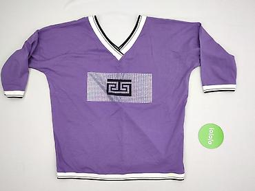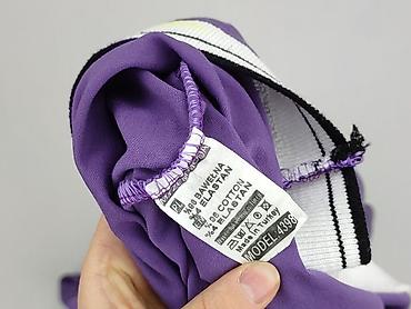 Fioletowa bluzka damska z krótkim rękawem - Krój: prosty, okrągły dekolt - Rękawy: krótkie z delikatnym bufowaniem i manszetą - Materiał: miękka, cienka dzianina bawełniana (na metce brak pełnych ...