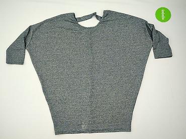 Szara bluzka damska z dzianiny, fason oversize z rękawami nietoperz (3/4). Lekko opadające ramiona, dekolt z paskiem/mostkiem z tyłu (efekt wycięcia). Elastyczna, miękka tkanina melanżowa.