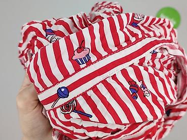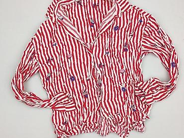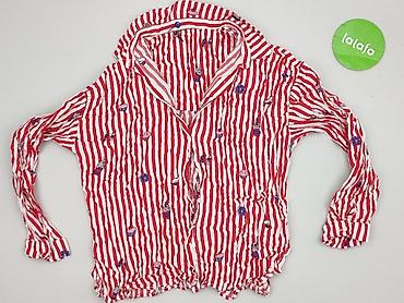 Bluzka damska z długim rękawem, zapinana na guziki. Wzór: czerwono‑białe pionowe paski z nadrukami słodkości (babeczki, lizaki, pączki, napoje). Kołnierzyk klasyczny, mankiety na guziki. Materiał lekki, cienki, miękki, marszczony z efektem „crinkle”. Dół i rękawy wykończone elastyczną gumką, która delikatnie dopasowuje bluzkę do sylwetki. Kolorystyka żywa, nadruki wyraźne.