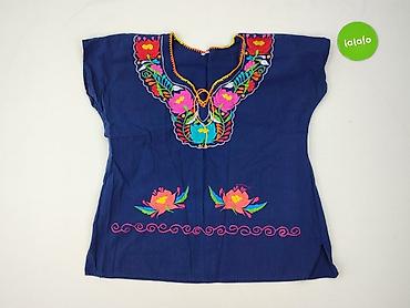 Bluzka damska etno/boho - Kolor: głęboki granat - Krój: luźny, z krótkim rękawem typu kimono - Dekolt: w kształcie litery V - Ozdoby: szerokie pasy haftu/lamówki o geometrycznym wzorze wzdłuż deko...Stan: