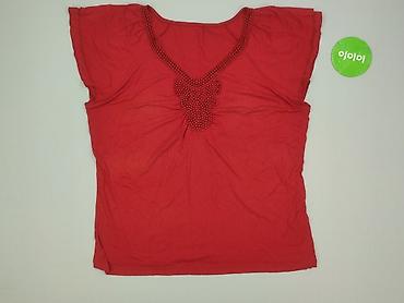 Bluzka damska w kolorze intensywnej czerwieni z ozdobnymi, drobnymi dżetami ułożonymi w krótkie linie na całej powierzchni. Luźny, pudełkowy krój z krótkim rękawem typu kimono i okrągłym dekoltem. ...