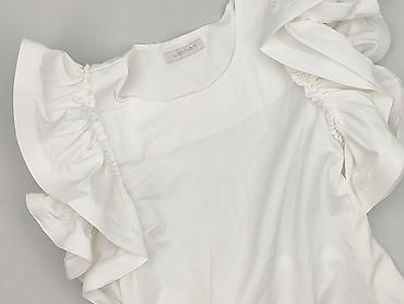 Bluzka damska biała z koronkową wstawką - Krój: luźny, lekko wydłużony tył, krótkie rękawki z delikatną falbanką - Dekolt: okrągły z wiązaniem na troczki - Góra: przezroczysta siateczka z kwiatowy...