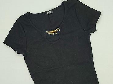 Czarna damska bluzka z krótkim rękawem, rozmiar L. - Krój prosty, wygodny, z okrągłym dekoltem. - Ozdoby w kolorze złotym: aplikacja przypominająca łańcuszek wokół dekoltu oraz zdobiony dół z mot...