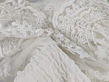 - Rękawy: długie, z transparentnego tiulu/siateczki, bogato zdobione haftowaną koronką w kwiatowe wzory; poszerzane przy mankietach z ozdobnym wykończeniem.