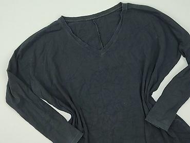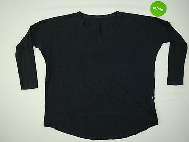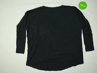 Czarna damska bluzka z długim rękawem i dekoltem w serek. Swobodny, lekko oversize’owy krój z obniżoną linią ramion; tył delikatnie dłuższy niż przód. Materiał: 89% bawełna, 11% elastan – miękki, elastyczny i komfortowy. Wyprodukowano w Polsce. Na metce rozmiar: F (luźny fason, pasuje na różne sylwetki). Gładka, bez nadruków; uniwersalna baza do codziennych stylizacji. Zalecenia pielęgnacji z metki: pranie w 30°C, nie wybielać, można prasować w niskiej temp., nie suszyć w suszarce. Kolor: czarny. Drobne mechacenia widoczne z bliska. Dla kobiety, nie dla niemowlęcia. Używana.