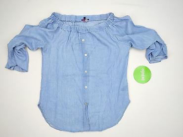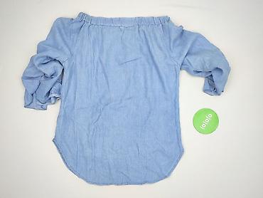 Bluzka damska hiszpanka, denimowy odcień niebieskiego - Krój: odsłaniane ramiona (hiszpanka) z elastyczną gumką przy dekolcie - Rękawy: 3/4 z wiązaniami przy mankietach - Zapięcie: rząd guzików z ...