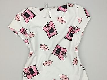 Bluzka damska May&CO, rozmiar M/L - Krój: luźny, z obniżoną linią ramion i krótkim rękawem - Kolor: biały - Przód: duży panel z nadrukiem graficznym (portret) na tle oliwkowym; dekoracyjne aplikac...