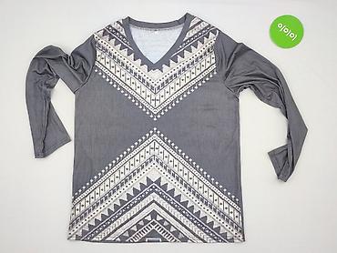Bluzka damska z długim rękawem, rozmiar L. - Wzór: geometryczny, retro – beżowo-szare prostokąty i owalne motywy na białym tle - Fason: luźny, prosty krój - Dekolt: w serek z krótką listwą guzikow...