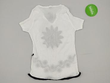 Bluzka damska biała z koronkową wstawką - Krój: luźny, lekko wydłużony tył, krótkie rękawki z delikatną falbanką - Dekolt: okrągły z wiązaniem na troczki - Góra: przezroczysta siateczka z kwiatowy...