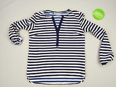 Bluzka damska w paski - Fason: luźny, z lekko obniżoną linią ramion - Dekolt: w serek z przodu, okrągły z tyłu - Rękaw: do łokcia/3/4 - Wzór: pionowe pasy w kolorze granatowym i białym - Materiał:...