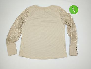 Bluzka damska z długim rękawem, rozmiar S. - Krój: prosta linia, lekko bufiaste rękawy. - Dekolt: szeroki, zdobiony koronkowymi aplikacjami-kwiatami na obu ramionach. - Wzór: beżowo-czarny, geomet...Stan:
