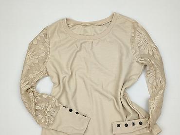 Bluzka damska z długim rękawem, rozmiar S. - Krój: prosta linia, lekko bufiaste rękawy. - Dekolt: szeroki, zdobiony koronkowymi aplikacjami-kwiatami na obu ramionach. - Wzór: beżowo-czarny, geomet...