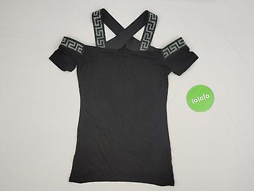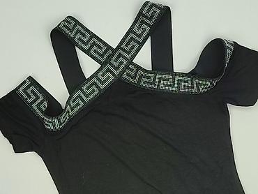 Czarna damska bluzka Trendy 18, rozmiar M. - Fason: dopasowany, z krótkim rękawkiem typu cap i okrągłym dekoltem. - Ozdoby: połyskujące aplikacje/kryształki z przodu ułożone w promienisty wzór. - ...