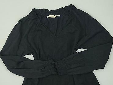 Bluzka damska z długim rękawem, czarna, zapinana na guziki z przodu. - Fason prosty, lekko taliowany, z dekoltem w kształcie delikatnej fali wzdłuż linii guzików - Ozdobne, materiałowe guziki na c...