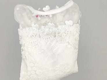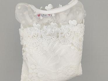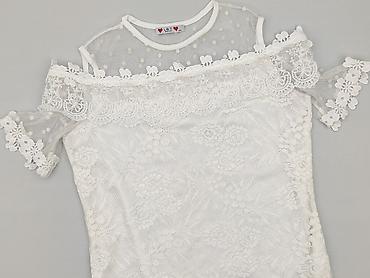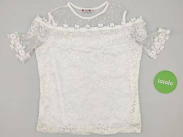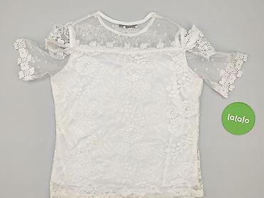 Bluzka damska biała z koronkową wstawką - Krój: luźny, lekko wydłużony tył, krótkie rękawki z delikatną falbanką - Dekolt: okrągły z wiązaniem na troczki - Góra: przezroczysta siateczka z kwiatowy...