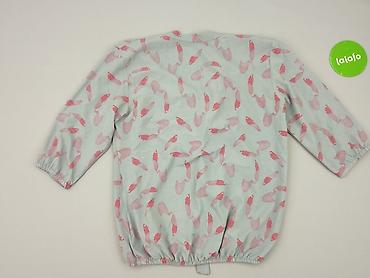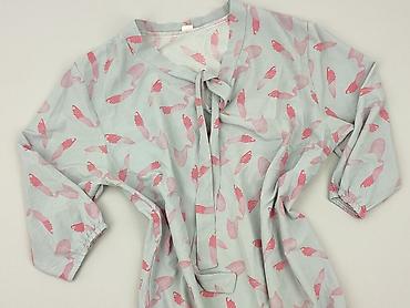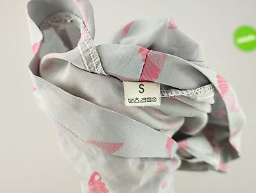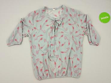 Bluzka damska, rozmiar S, z nadrukiem w różowe ptaki na jasnoszarym tle. Luźny, lekko oversize’owy krój z raglanowymi rękawami 3/4 zakończonymi gumką. Dekolt w serek z wiązaniem oraz krótką listwą z pętelką dekoracyjną. Dół także wykończony gumką, co nadaje swobodny, balonowy efekt. Miękki, cienki materiał przyjemny w dotyku; na metce piktogramy pielęgnacji (pranie do 40°C, prasowanie, itp.). Idealna do casualowych stylizacji z jeansami lub spódnicą. Kolory: jasnoszary z różowymi akcentami. Dla kobiet. Używana.