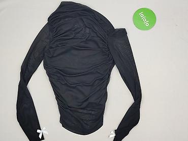 Czarna damska bluzka z długim rękawem - Fason dopasowany, z delikatnymi marszczeniami z przodu, wydłużony tył. - Okrągły dekolt z wstawką z koronki/tiulu zdobioną cekinami w górnej części przodu –...
