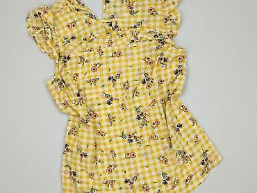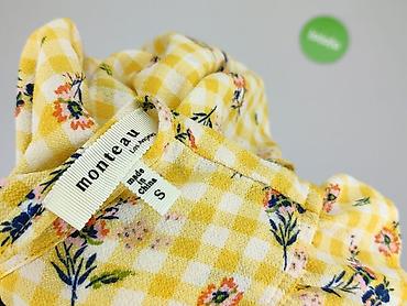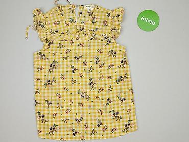 Żółta bluzka damska z krótkim rękawem - Krój: luźny, z obniżoną linią ramion; dekolt w kształcie litery V z ozdobną plisą. - Rozmiar: S (z metki). - Materiał: 95% poliester, 5% spandex – lekko ela...