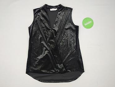 Czarna bluzka damska z krótkim rękawem z tiulu - Rozmiar: S (na metce) - Materiał: 100% poliester - Krój: dopasowany, długość do bioder - Dekolt: szeroki, zaokrąglony - Rękawy: bufiaste, wykonane ...