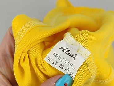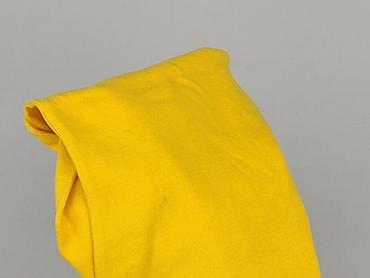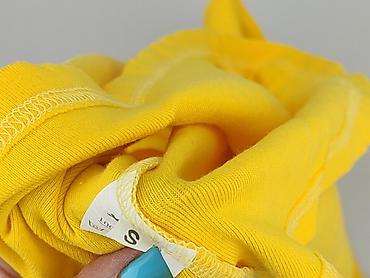 Żółta bluzka damska z krótkim rękawem - Krój: luźny, z obniżoną linią ramion; dekolt w kształcie litery V z ozdobną plisą. - Rozmiar: S (z metki). - Materiał: 95% poliester, 5% spandex – lekko ela...