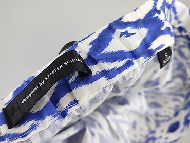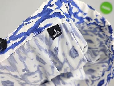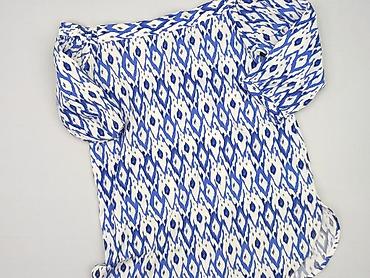 Damska koszula/bluzka z krótkim rękawem - Rozmiar: 36 - Krój: dopasowany, zapinana na guziki z przodu - Kołnierzyk: okrągły, kontrastowy biały, z białą plisą przy zapięciu - Wzór: drobna niebiesko...