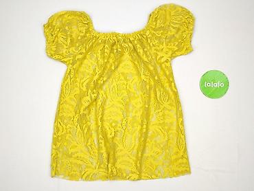 Żółta bluzka damska z krótkim rękawem - Krój: luźny, z obniżoną linią ramion; dekolt w kształcie litery V z ozdobną plisą. - Rozmiar: S (z metki). - Materiał: 95% poliester, 5% spandex – lekko ela...