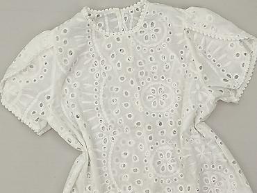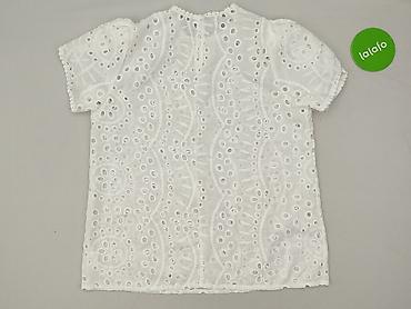 Biała bluzka damska z koronką – rozmiar XS - Fason: prosta, lekko luźna, z dekoltem w serek zdobionym ażurową aplikacją. - Rękawy: krótkie, szerokie, w całości z koronkowej, ażurowej tkaniny o kwi...