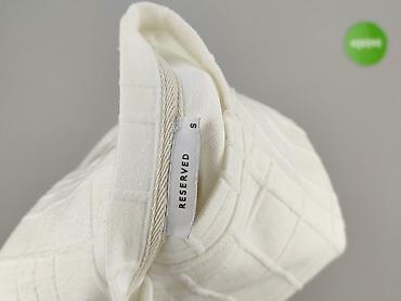 Bluzka damska Reserved, rozmiar S. - Kolor: biel z czarnym, roślinnym printem - Materiał: 100% poliester (metka w zestawie) - Krój: swobodny, lekko wydłużony dół - Dekolt: marszczony/ściągany gumk...