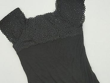 Czarna bluzka damska bez rękawów z ozdobną koronką przy dekolcie i na plecach (motyw kwiatowy, w kształcie litery V). - Krój: luźniejszy, z krótkimi rękawkami typu cap. - Dekolt: okrągły z przodu...