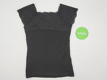Bluzka damska, czarna, z krótkim rękawem. - Fason: prosta, lekko dopasowana - Dekolt: okrągły z ażurowym wykończeniem - Rękawy: krótkie, zakończone ażurową lamówką - Dół: ażurowe, falowane wykończ...