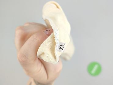 Bluzka damska, krótki rękaw, ecru/kremowa. - Fason: luźny, z okrągłym dekoltem - Rękawy i dół wykończone falbankową (marszczoną) lamówką - Materiał: miękka, elastyczna dzianina o drobnym prążku; p...Stan: