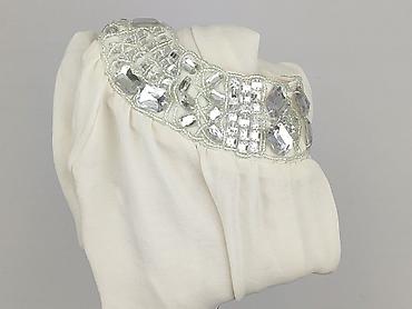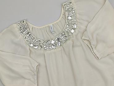 Bluzka damska, kremowa, z krótkim rękawem - Materiał: lekka, półprzezroczysta tkanina o miękkim chwycie (delikatnie lejąca), lamowane wykończenia. - Krój: luźniejszy, prosty, z obniżoną linią rami...