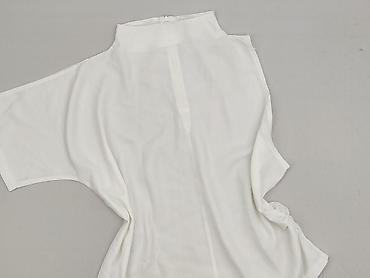 Biała bluzka damska z krótkim rękawem - Krój: luźna góra z szerokim, elastycznym pasem u dołu (smocking) podkreślającym talię - Dekolt: prostokątny, lekko odkryte ramiona - Rękawy: krótkie, delika...