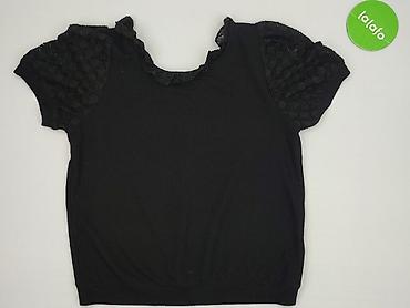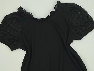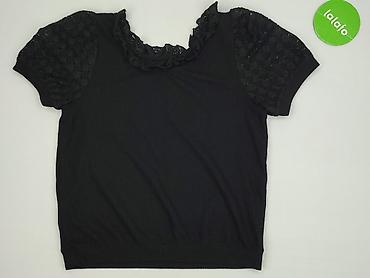Bluzka damska, czarna, z krótkim rękawem. - Fason: prosta, lekko dopasowana - Dekolt: okrągły z ażurowym wykończeniem - Rękawy: krótkie, zakończone ażurową lamówką - Dół: ażurowe, falowane wykończ...
