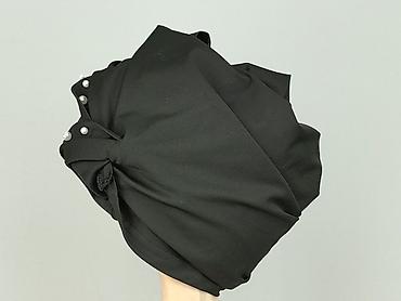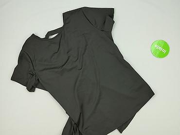 Czarna bluzka damska z krótkim rękawem, rozmiar XL. Lekko pudełkowy krój z obniżoną linią ramion i okrągłym dekoltem. Z tyłu niewielkie rozcięcie zapinane na guzik. Dół z wydłużonymi panelami/supła...Rozmiar: