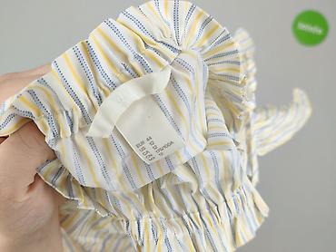 Żółta bluzka damska z krótkim rękawem - Krój: luźny, z obniżoną linią ramion; dekolt w kształcie litery V z ozdobną plisą. - Rozmiar: S (z metki). - Materiał: 95% poliester, 5% spandex – lekko ela...