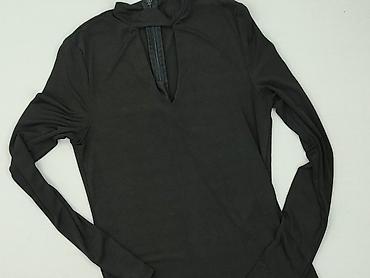 Czarna bluzka damska Reserved z długim rękawem. - Materiał: 95% wiskoza, 5% elastan – miękka, elastyczna dzianina dopasowująca się do sylwetki. - Fason: dopasowany, z wyższą stójką. - Detale: z pr...